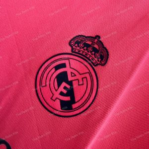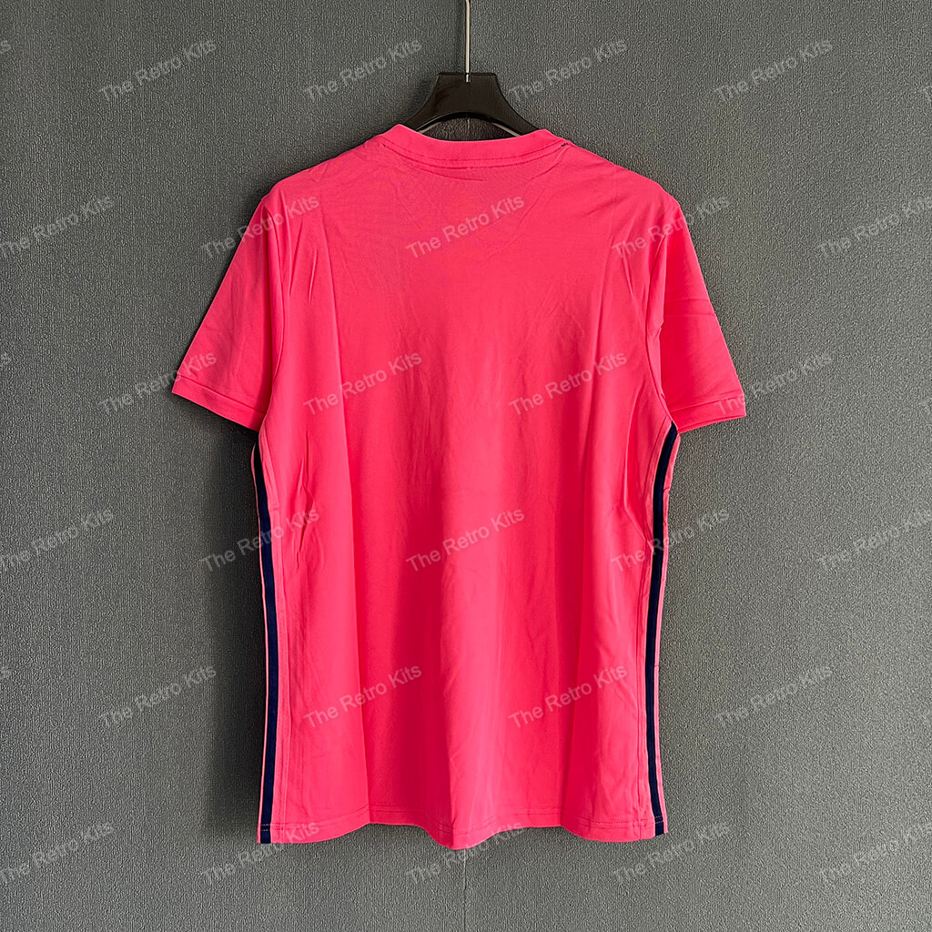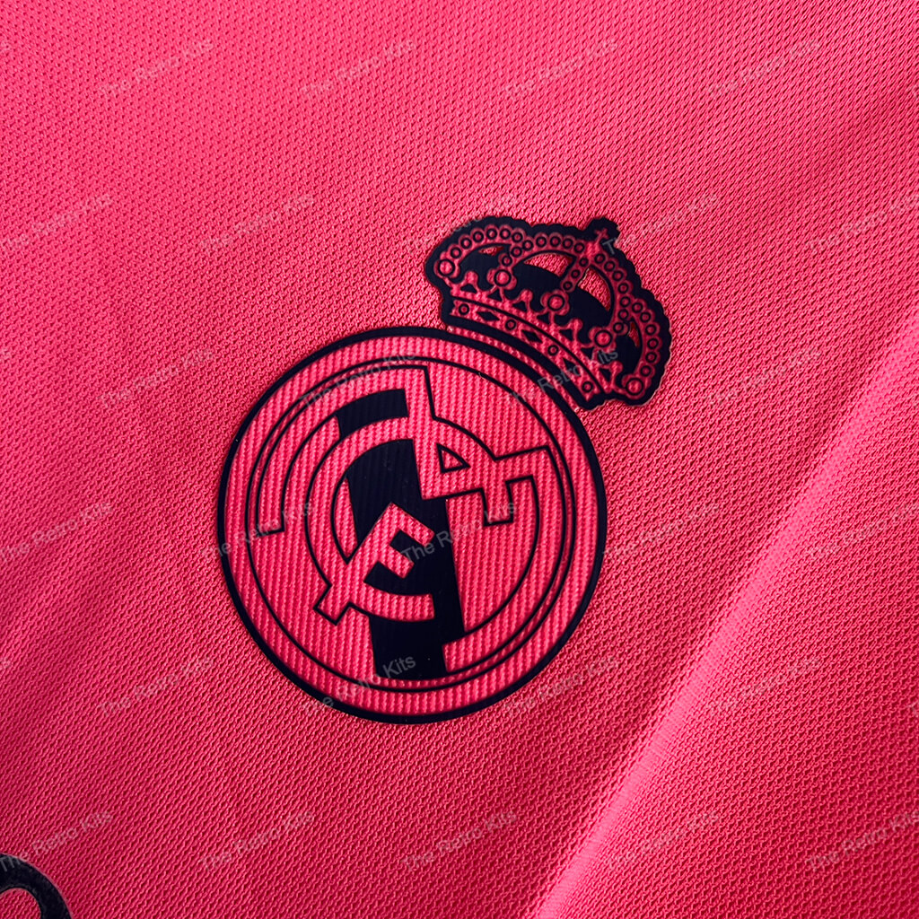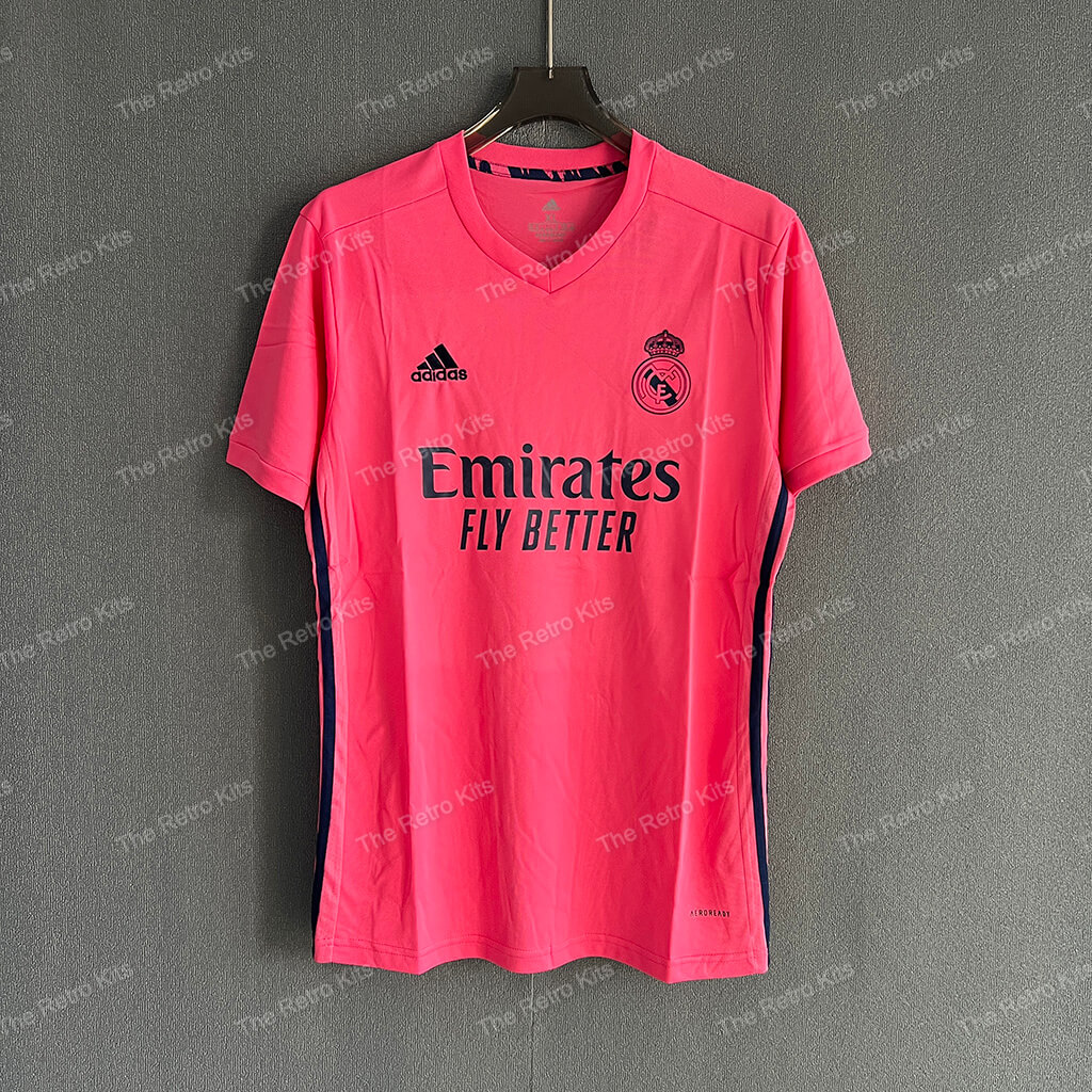 The Real Madrid 2020/2021 Away Kit featured a striking coral pink design, bringing back a colour the club had used in past European campaigns. The shirt included subtle tonal patterns across the fabric, paired with navy detailing on the collar, sleeves, and logos to give it a sharp contrast. The Fly Emirates sponsor and modern Real Madrid crest appeared in dark navy, completing the clean and contemporary look. Worn by stars such as Karim Benzema, Luka Modrić, Sergio Ramos, and VinÃcius Júnior, this away kit became a fan favourite for its bold colour and stylish, modern identity during the 2020/21 season.
