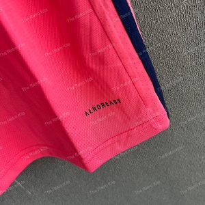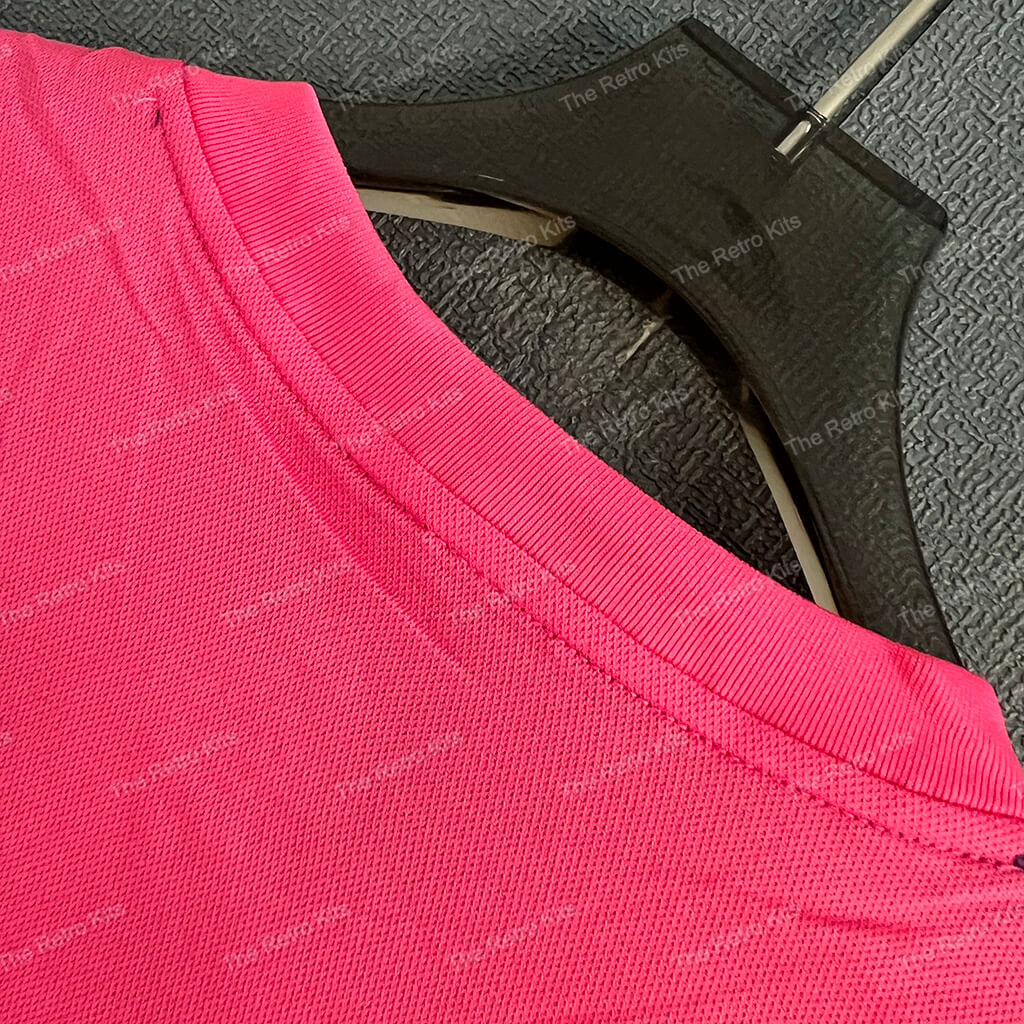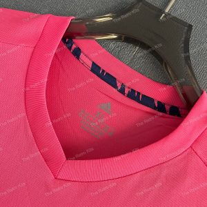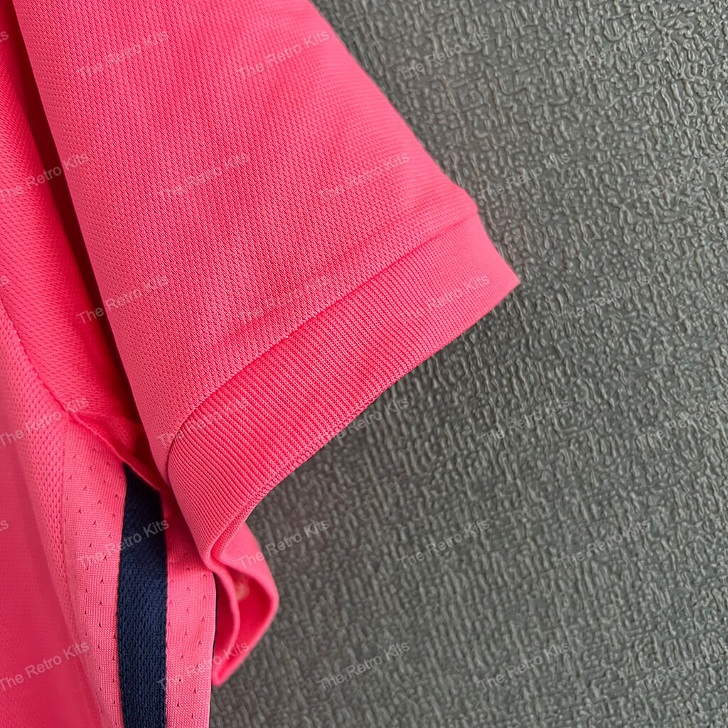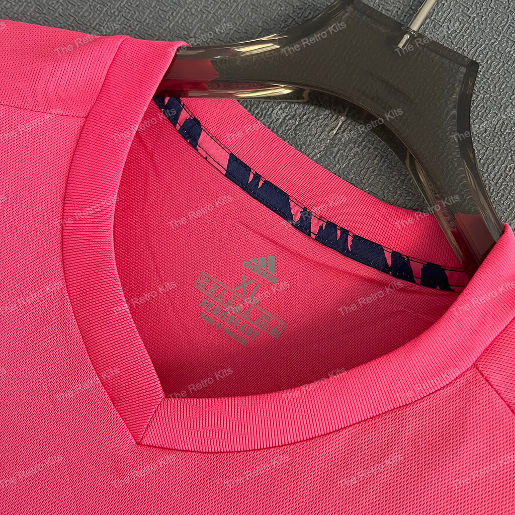 The Real Madrid 2020/2021 Away Kit featured a striking coral pink design, bringing back a colour the club had used in past European campaigns. The shirt included subtle tonal patterns across the fabric, paired with navy detailing on the collar, sleeves, and logos to give it a sharp contrast. The Fly Emirates sponsor and modern Real Madrid crest appeared in dark navy, completing the clean and contemporary look. Worn by stars such as Karim Benzema, Luka Modrić, Sergio Ramos, and VinÃcius Júnior, this away kit became a fan favourite for its bold colour and stylish, modern identity during the 2020/21 season.