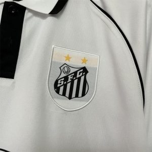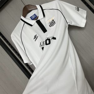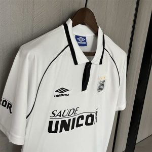 The 1997 Santos FC home shirt featured the club’s traditional all-white design with thin black trim on the collar and sleeves, paired with white shorts and socks. It displayed the Unicor across the chest alongside the Santos crest, giving it a clean yet distinctly 90s Brazilian look. Worn by players such as Giovanni, Alessandro, and Narciso, this kit represented Santos during a competitive era in Brazilian football, reflecting the club’s elegance, identity, and attacking spirit.
