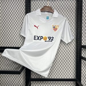 The 1987–90 Sevilla home shirt featured a classic all-white design with subtle red trim on the collar and cuffs, staying true to the club’s traditional look. It carried the Expo 92 sponsor, promoting the Seville World Expo, across the chest, along with the club crest on the front. Paired with white shorts and socks, this kit represented Sevilla throughout the late 1980s. Worn by players such as Francisco, Manolo Jiménez, and Ricardo Serna, it marked an important era as the club consolidated its place in La Liga.