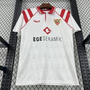 The 1992/93 Sevilla home shirt featured a traditional white design with red trim on the collar and cuffs. This version carried the Egeseramik sponsor across the chest, making it a rarer variant from that season. Paired with white shorts and socks, the look remained faithful to the club’s classic identity. Worn by players such as Davor Šuker, Diego Simeone, and Rafa Paz, this kit was used during the club’s La Liga campaign in the early 1990s, a period when Sevilla were beginning to attract big names and build towards a stronger future.