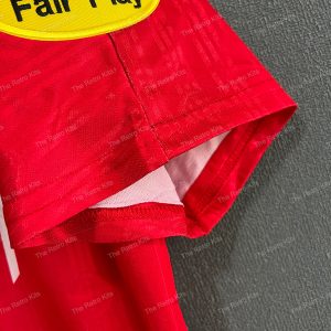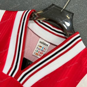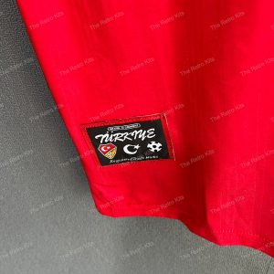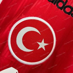 The 1996 Turkey home shirt featured a white base with bold red horizontal chest stripes, reflecting the design of the national flag. It displayed the crescent and star emblem on the chest and was paired with white shorts and socks. Worn by players such as Rüştü Reçber, Alpay Özalan, and Hakan Şükür, this kit was used at UEFA Euro 1996 in England, marking Turkey’s first-ever appearance at a European Championship.