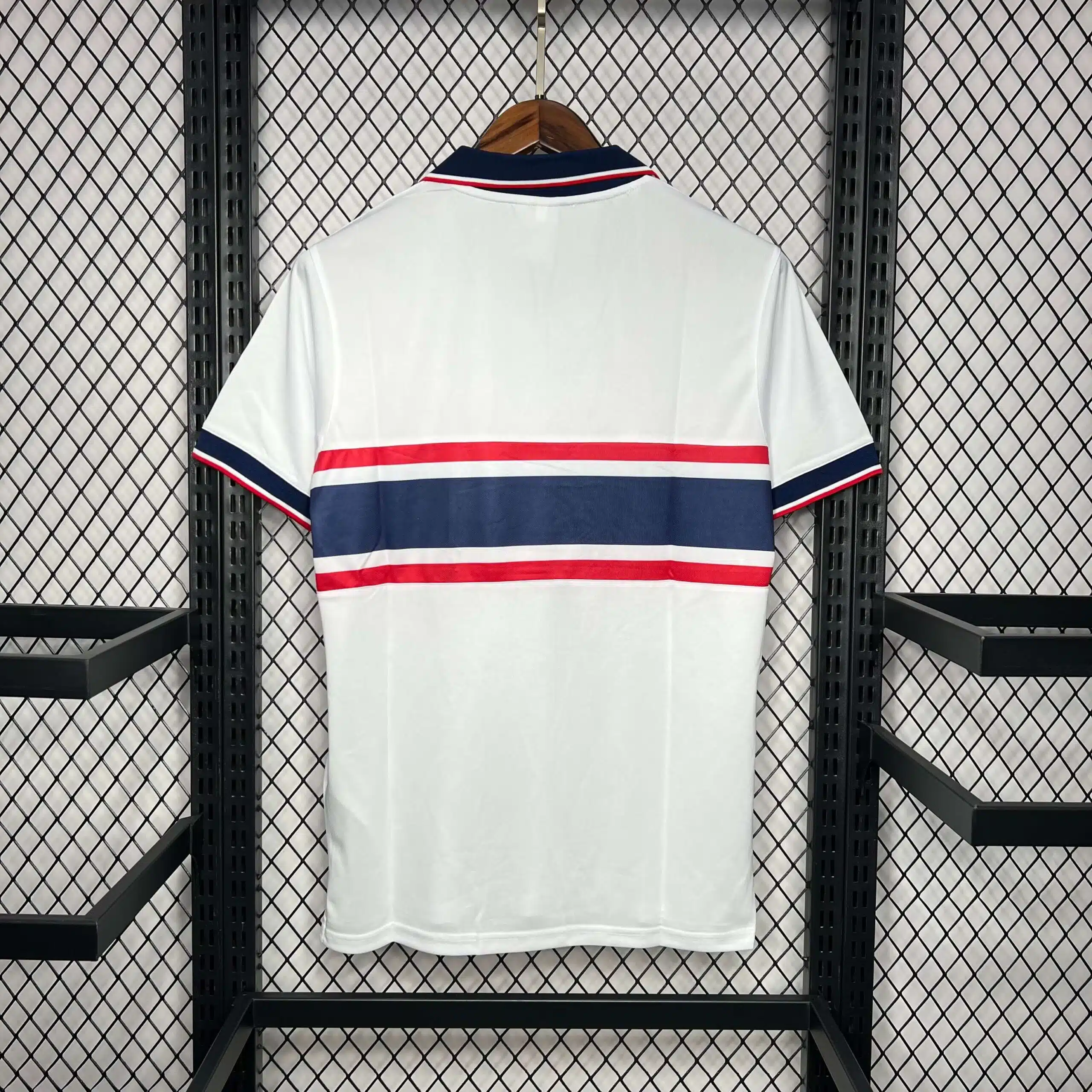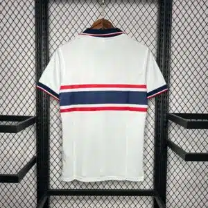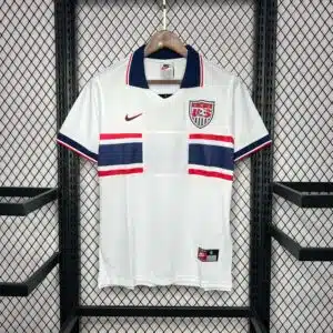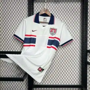 The 1995 USA home shirt featured a classic white design with bold red and navy striping across the shoulders and sleeves, paired with navy shorts and white socks. It carried the US Soccer crest on the chest. Worn by players such as Alexi Lalas, Eric Wynalda, and Cobi Jones, this kit gained recognition at the 1995 Copa América in Uruguay, where the United States impressed by reaching the semi-finals, defeating Argentina 3–0 along the way.